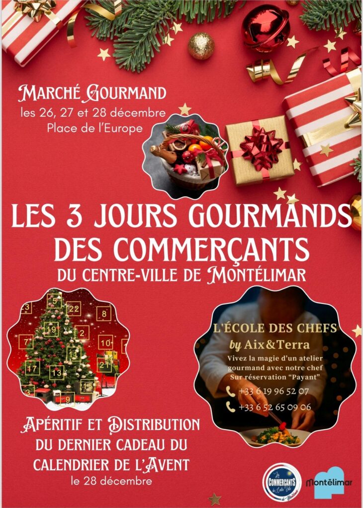 – Ateliers gourmands par l’Ecole Des Chefs by Aix&Terra : samedi et dimanche de 10h00 à 12h00 apprenez à réaliser 1 menu de fête en direct sur le marché et déguster vos préparations ! (25 € par personne sur réservation au 06 19 96 52 07 ou 06 52 65 09 06 dans la limite des places disponibles)