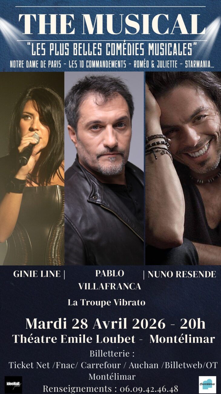 Un spectacle exceptionnel qui vous fera revivre les plus grands moments des comédies musicales ! Les voix emblématiques de Pablo Vilafranca, Ginie Line et Nuno Resende, accompagnées de la troupe Vibrato, vous invitent à un voyage musical inoubliable à travers les plus grands succès des comédies musicales. Revivez les chansons mythiques de : Notre-Dame de Paris, Les Dix Commandements, Le Roi Soleil, Roméo et Juliette, Starmania, Mozart l’Opéra Rock, West Side Story et bien d’autres encore… Deux heures de spectacle, d’émotions et de grands classiques qui feront vibrer toutes les générations ! Chant, passion, énergie et souvenirs… un rendez-vous incontournable pour tous les amoureux de la comédie musicale.