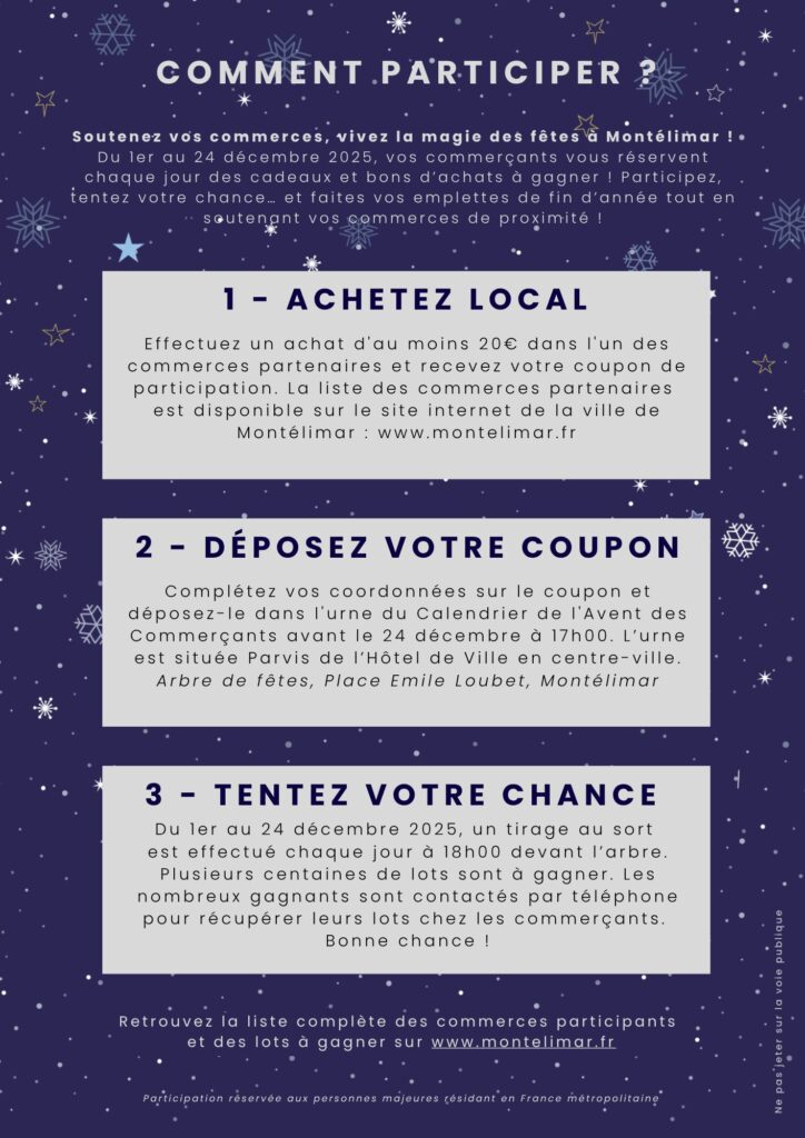 - 2. Complétez vos coordonnées sur le coupon et déposez-le dans l’urne du Calendrier de l’Avent des Commerçants avant le 24 décembre à 17h00. L’urne est située Parvis de l’Hôtel de Ville en centre-ville, Place Emile Loubet, Montélimar (à partir du 26/11/2025).