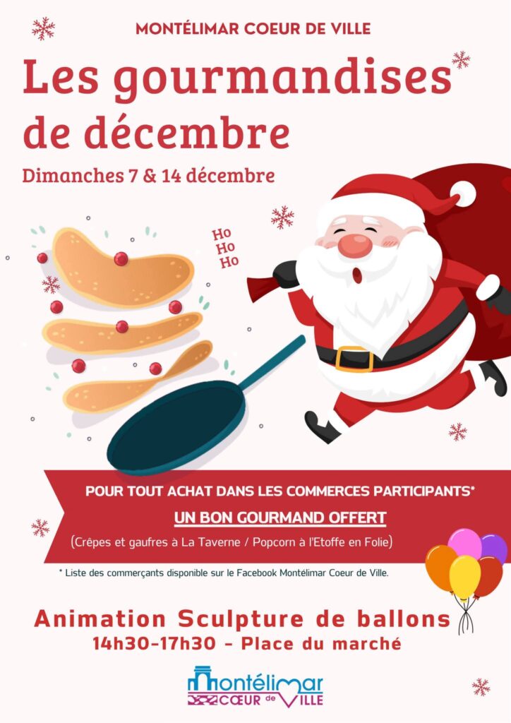 - De 14h30 à 17h30, retrouvez une animation de sculpture de ballons sur la Place du Marché et crêpes et gaufres en folie chez les commerçants participants. Voir ici.